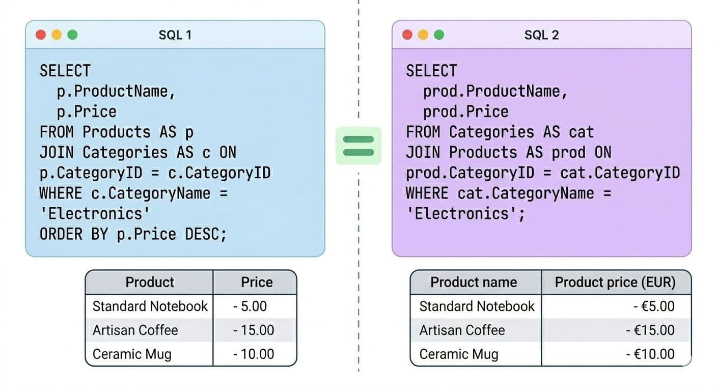 The first compares the three SQL queries against each other, pair by pair: SQL 1 vs 2, SQL 1 vs 3, SQL 2 vs 3. Each pair is classified as identical, logically equivalent, or different. Logically equivalent means different syntax that would produce the same meaningful result: a different JOIN order, different table aliases, columns listed in a different sequence in the SELECT, or WHERE conditions written in a different order. Those aren't real differences and aren't penalized.